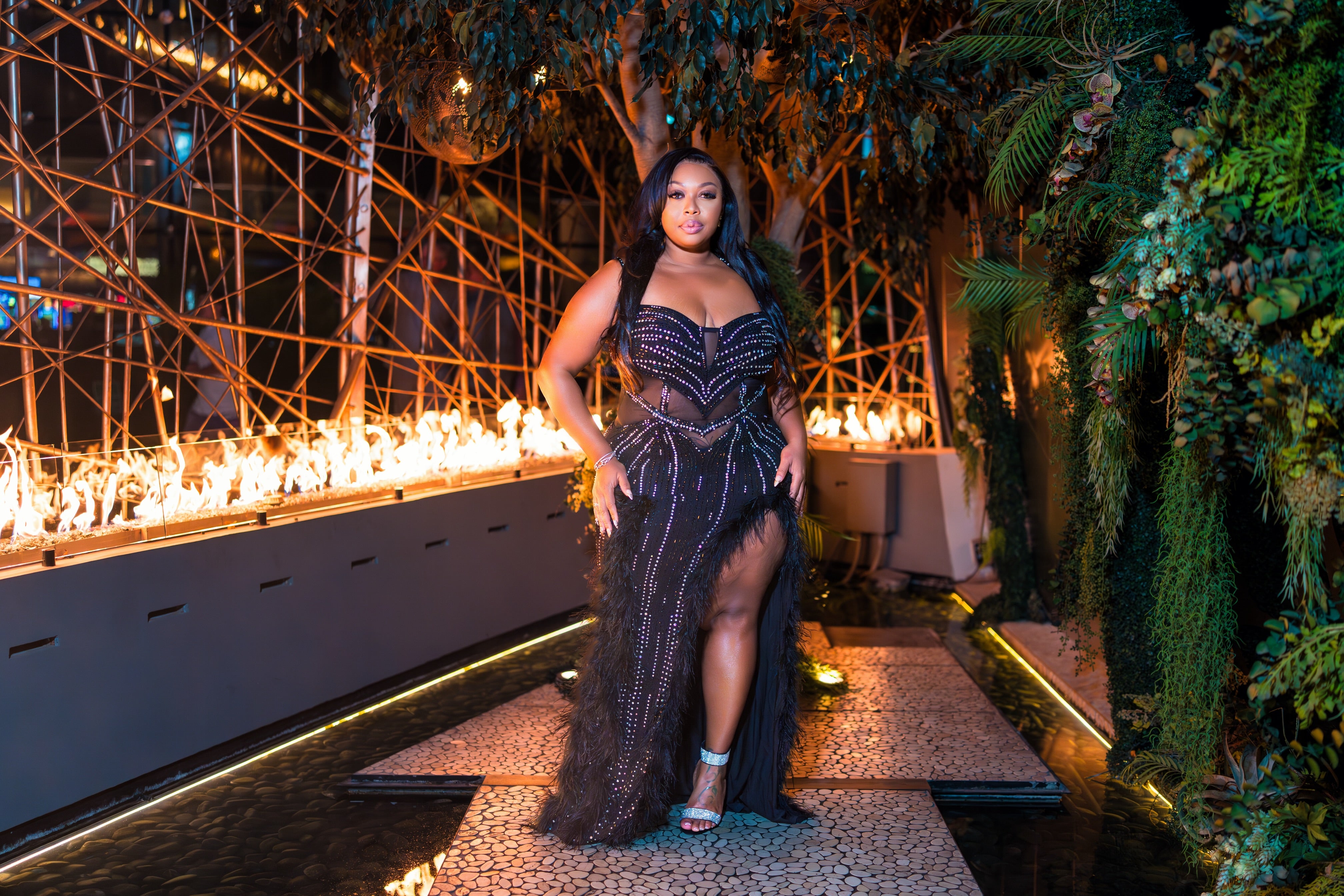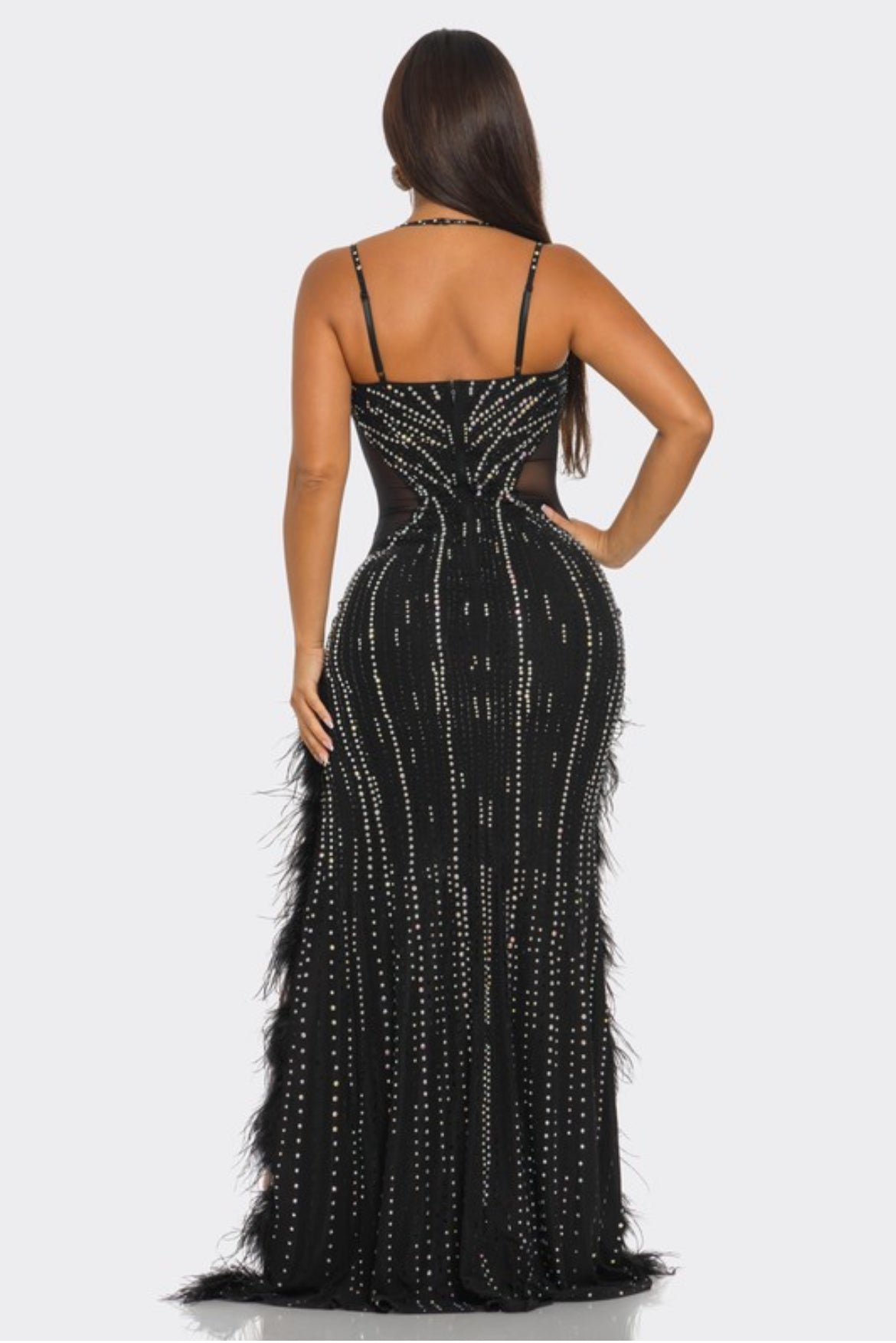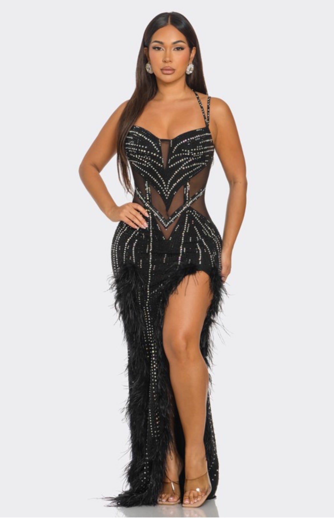 Rhinestone embellished, feather trimFront and middle meshinvisible zipper side zipper 90% nylon 10% spandex model is wearing a L has great stretch